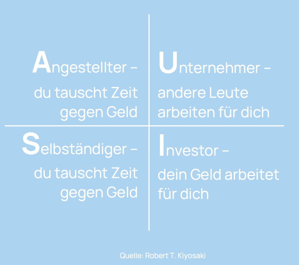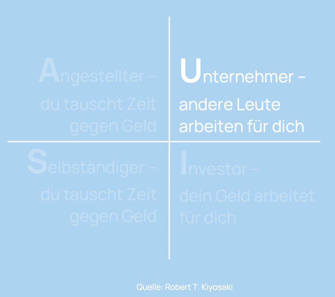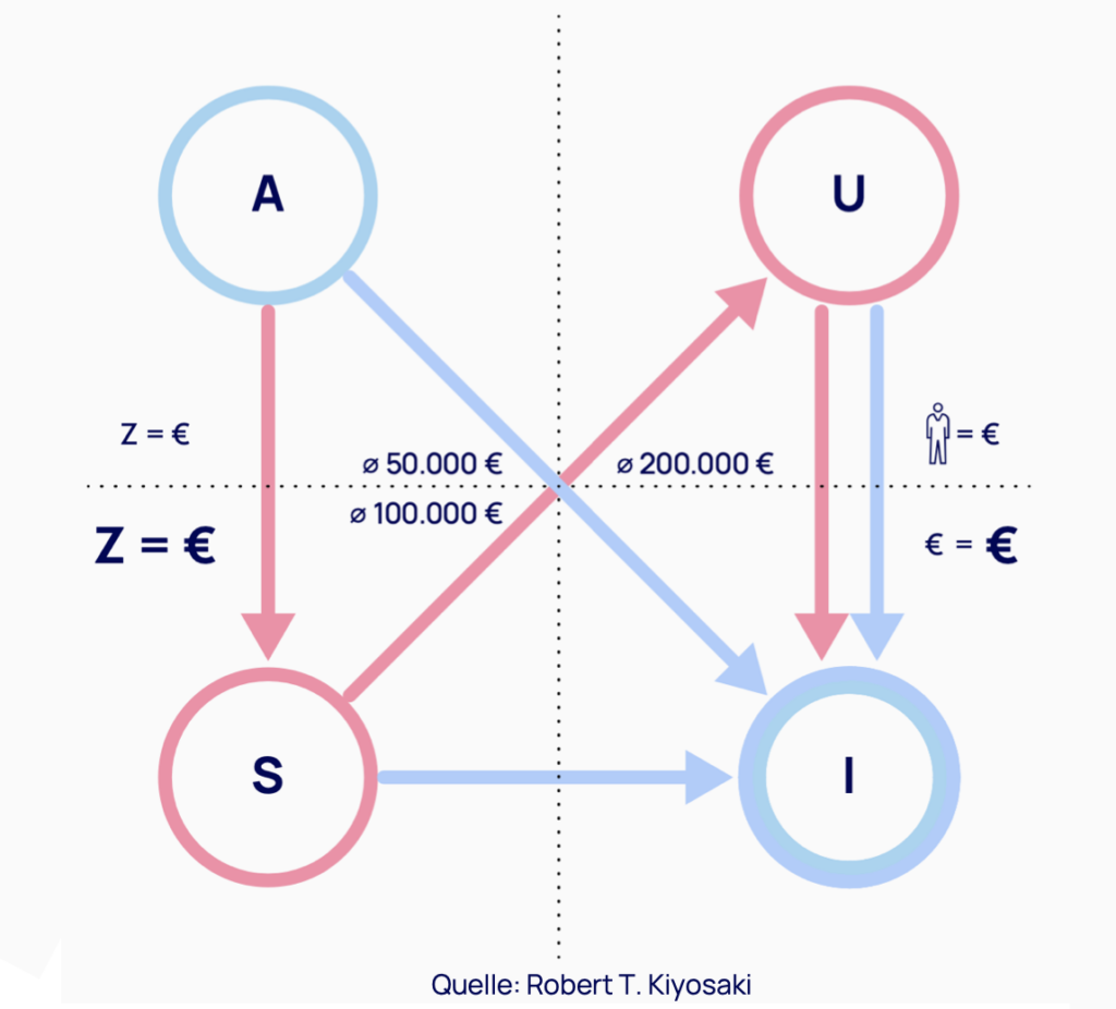 Finanzielle Abhängigkeit vermeiden und finanzielle Unabhängigkeit erreichen: Hier möchten wir dir aufzeigen, wieso dieses Konzept entstanden ist und warum sich im Grunde jeder damit ernsthaft beschäftigen sollte, der individuelle Freiheit anstrebt. Stell dir parallel selbst die Frage, wie du Freiheit für dich definierst. Ohne “Gesundheit” geht nichts, das ist klar. Es geht im Leben ja auch nicht immer ums Geld, aber alles kostet Geld. Also hängt Freiheit auch von “Geld” ab. Du kannst niemals richtig frei sein, ohne auch finanziell frei zu sein. Dazu kommt der ganz wesentliche Faktor “Zeit”. Freiheit mag frei sein, aber bist du bereit den Preis zu zahlen? Der Preis liegt darin, deine Ressourcen, wie Zeit und Geld sinnvoll einzusetzen. Geld ist ein Mittel zum Zweck, die Frage ist nur welchen Zweck du verfolgst, bzw. welchen Lebensweg du gehen möchtest. Mit unserem Konzept wollen wir dir ein Mittel zum lebenslangen Geldfluss auf deinem Lebensweg anbieten. Wenn Geld ein Mittel zum Zweck ist, musst du dich fragen, welchen Zweck du verfolgst. Oder anders gefragt: Welche Ziele verfolgst du auf deinem Lebensweg? Laut einer Studie über Harvard-Studenten machen sich nur 17 Prozent aller Absolventen Gedanken über ihre tatsächlichen Ziele nach ihrem Abschluss, weshalb sie fokussierter sind und im Schnitt das Dreifache der restlichen 83 Prozent verdienen. Anders gesagt haben 83 Prozent der Absolventen überhaupt keine Zielsetzungen für ihre Karriere. Lediglich drei Prozent der Absolventen hatten klare Ziele für ihre Karriere und diese auch schriftlich fixiert. Diese drei Prozent verdienen im Schnitt das Zehnfache der Absolventen, die gar keine Ziele hatten. Daraus lässt sich folgern, dass die Gruppe derjenigen, die sich ernsthaft mit ihren Zielen auseinandersetzt, sehr klein ist. Außerdem ist der Einkommensunterschied zwischen denjenigen, die klare schriftliche Ziele haben und denen, die keine klaren Ziele haben, sehr groß. “Angestellte” tauschen im Grunde Zeit gegen Geld/Gehalt. Wie viel verdient ein Angestellter (ohne Personalverantwortung) im Schnitt in Deutschland jährlich? Angestellte (ohne Personalverantwortung) verdienen durchschnittlich ca. 50.000€ brutto jährlich. Leider sind Gehaltssprünge ab dem 35. Lebensjahr meistens nicht sehr wahrscheinlich und Frauen verdienen leider immer noch deutlich weniger als Männer. Knapp 90 Prozent der Deutschen arbeiten im Angestelltenverhältnis. Wir kennzeichnen den oberen linken Quadranten mit einem “A”, Hast du in deinem Job die Möglichkeit Personalverantwortung zu übernehmen? Denn wer als Angestellter gut verdienen will, muss wohl Führungskraft werden! Hier liegt der durchschnittliche Verdienst deutlich höher. Was charakterisiert einen “Angestellten” noch? Nach Robert T. Kiyosakis “Cashflow-Qudrant” wird in vier grundlegenden Kategorien von Einnahmequellen unterschieden. Dieser kann dir helfen, deinen Lebensweg zu finden, denn Menschen werden – wie wir alle wissen – in der Schule darauf vorbereitet, einen Job im Angestelltenverhältnis, oder vielleicht auch in der Selbstständigkeit, auszuüben. Leider geht es in der Schule nicht darum einen Lebensweg zu finden. Manche Menschen wissen zwar sehr früh, was sie wollen, aber nicht jeder findet seinen Weg so schnell. Doch auch bei manchen dieser Personen wirst du feststellen, dass sie Berufe gefunden haben und keine Lebenswege (=Berufungen). Also wie findet man seinen Lebensweg in finanzieller Unabhängigkeit? Lass uns gemeinsam versuchen, diesem Weg näher zu kommen. Wer arbeitet denn nicht mehr für die Ziele seines Chefs, tauscht dennoch Zeit gegen Geld? Viele Angestellte bauen sich mittlerweile ein zweites berufliches Standbein auf, um finanziell unabhängiger zu sein. Auf zwei Beinen steht es sich bekanntlich stabiler. Wenn eines wegzubrechen droht, wie beispielsweise durch eine Krise, dann findet man finanziellen Halt auf dem anderen Standbein. Der Quadrant unten links wird mit einem “S” für den “Selbstständigen” gekennzeichnet, da es der nächste Schritt eines Angestellten sein kann und immer häufiger ist. Hast du dir mal überlegt, dich selbstständig zu machen? Selbstständige tauschen aber oft nach wie vor Zeit gegen Geld. Sie investieren meist mehr Zeit, als die Angestellten, weshalb sie im Schnitt auch deutlich mehr verdienen – durchschnittlich ca. 100.000€ brutto jährlich. Das liegt unter anderem daran, dass sie für ihre eigenen Ziele arbeiten. Sie sind allerdings auch von ihrer Arbeitskraft abhängig. Das heißt, wenn sie nicht arbeiten können, verdienen sie auch kein Geld. Der Selbstständige sollte sich also gegen den Verlust seiner Arbeitskraft absichern und dementsprechend einen gewissen Beitrag zur Absicherung des Risikos investieren. Später, wenn ein Selbstständiger in Rente geht, kann er nicht auf die gesetzliche Rente bauen, da er sich zumeist davon befreien hat lassen. Auch wenn nicht, besteht hier dringender Bedarf privat vorzusorgen, um den Lebensstandard des Erwerbslebens im Rentenalter halten zu können. Wenn es ein Selbstständiger schafft Personal zu beschäftigen und somit Menschen für sich arbeiten zu lassen, hat er den Sprung zum “Unternehmer” geschafft. Er hat sein Geschäft somit skaliert, wodurch es dann nicht mehr zwingend von seiner Anwesenheit abhängt. Daher wird der obere rechte Quadrant mit einem “U” gekennzeichnet. Wie würdest du das Dasein eines Unternehmers noch beschreiben? Ein Unternehmer lässt Menschen für sein Unternehmen arbeiten und verdient damit sein Geld. Seine Anwesenheit treibt das Geschäft voran, jedoch ist sie nicht mehr zwingend notwendig, da Unternehmer Personal einstellen, welches Aufgaben und Verantwortungen übernehmen. Was schätzt du verdient ein Unternehmer (zum Beispiel der Geschäftsführer einer GmbH) durchschnittlich jährlich? Das durchschnittliche Einkommen eines deutschen Unternehmers liegt bei ca. 200.000€ brutto jährlich! Unternehmer sind oft a